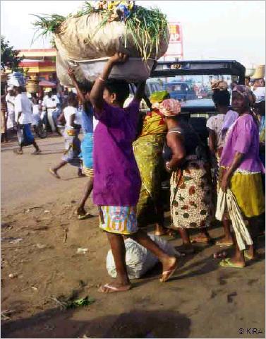 Il est rare de se promener dans les allées du Grand Marché ou du marché Hédzranawa de Lomé sans voir des femmes ou des filles portefaix. Au milieu des étalages, des commerçants, attendent les clients, on les voit passer, presque toujours en mouvement. Dès fois dans leurs blouses d’identification, elles se faufilent entre les passants, le visage déjà ridé et sur lequel se dessine la misère, par l ’effort qu ’elles déploient à porter ces fardeaux d ’un étalage à l ’autre ou jusqu’au véhicule du client. Mais, tout ceci pour combien ? Et dans quelle condition